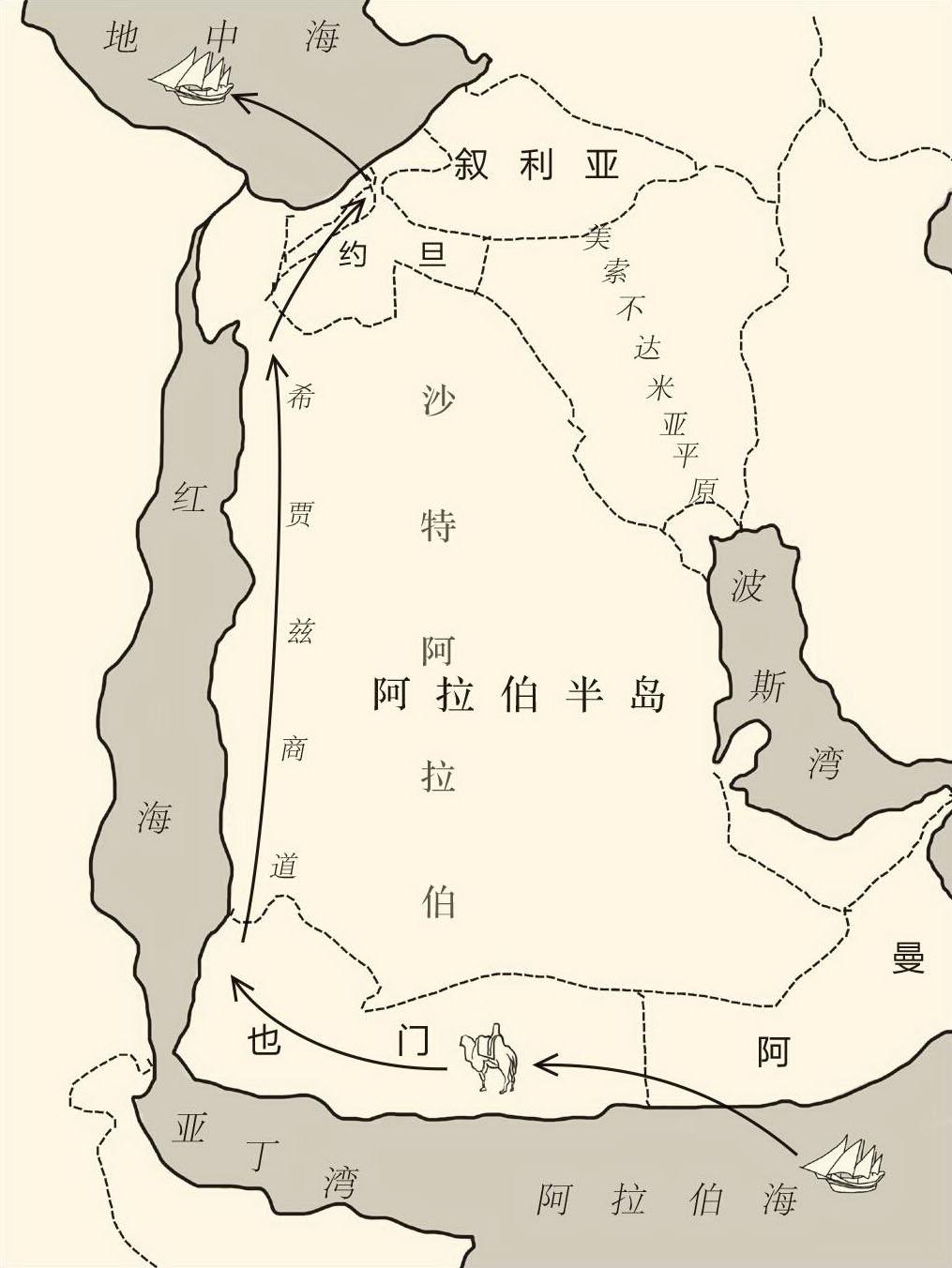 商道叫希贾兹(Hejaz),又译汉志。它北起约旦,南至也门,中经沙特阿拉伯王国三省,背靠希贾兹山脉而与红海平行,并且跟红海一样狭长,历来就是连接欧亚两洲的商贸之路。那些装在帆船上的东方商品——主要是奢侈品,包括产自印度和中国的宝石、香料和丝绸,经由阿拉伯海运到也门以后,为了避开拜占庭和波斯人的战乱,往往选择走陆路运往叙利亚和地中海岸,再运往欧洲卖出大价钱。