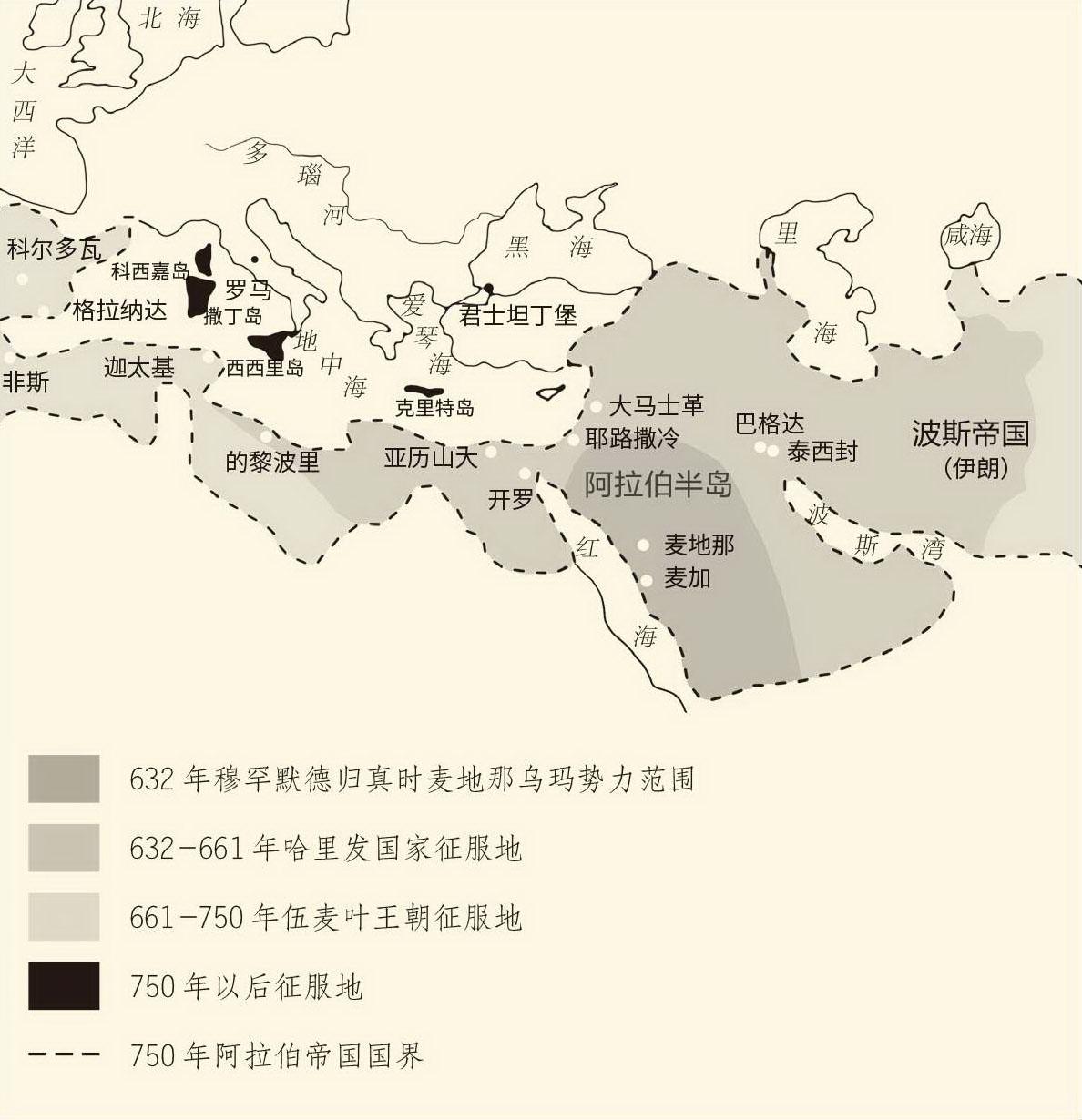 光荣归于真主,哈里发也功不可没,尤其是征战最多的第二任哈里发欧麦尔('Umar)。实际上从统一了半岛的首任哈里发阿布·伯克尔(Abū Bakr)开始,乌玛就不再是社团或公社,而应该称之为“哈里发国家”。不过,这个国家虽然已经具有对外征服的帝国特征,却没有世袭的皇帝。他们的版图之大有如秦汉,权力的交接却类似于尧舜。这当然难以为继,哈里发国家也迟早要变成阿拉伯帝国。