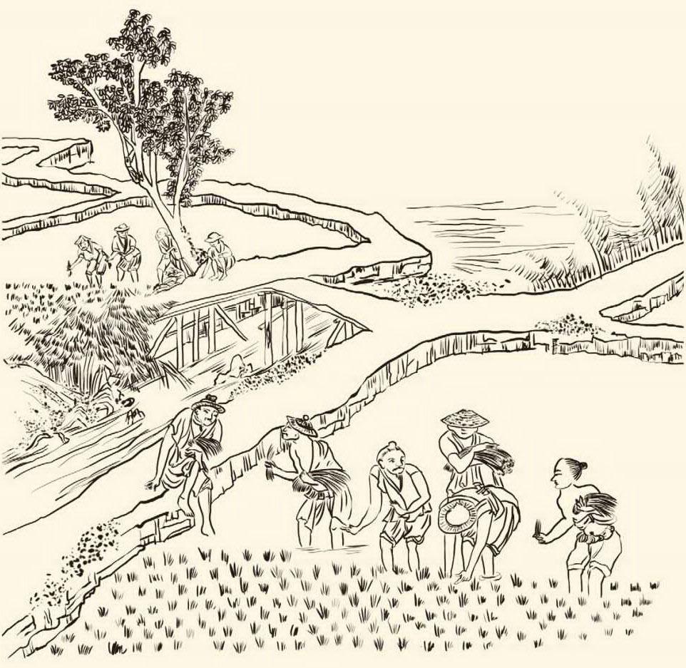 据清宫廷画家焦秉贞所作《御制耕织图》1696年版本。该图册含耕种图23幅、纺织图23幅,每幅图配康熙诗一首。