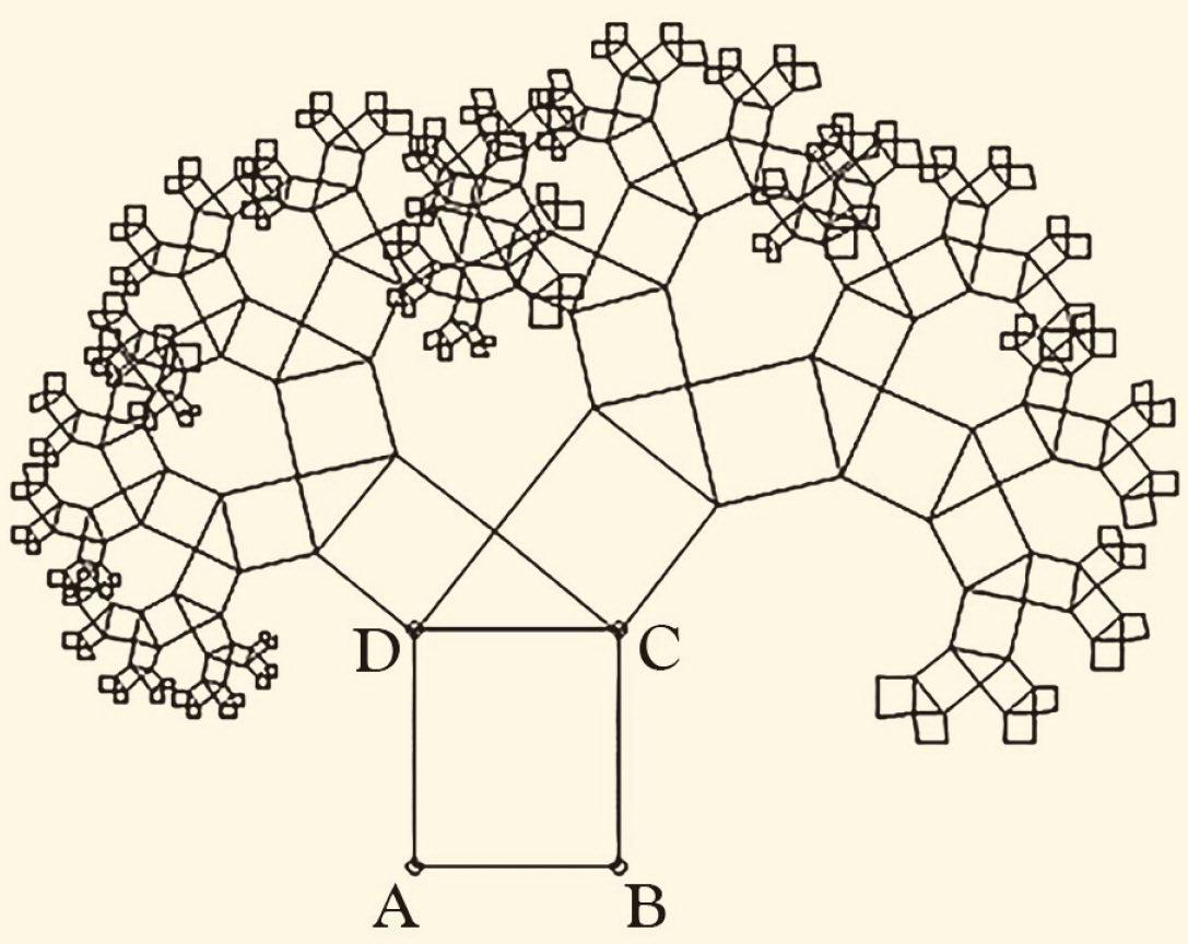 毕达哥拉斯根据勾股定理绘出的可以无限重复的图形,因为形似树,被称为毕达哥拉斯树。图中两个相邻小正方形面积的和等于相邻大正方形的面积;直角三角形两个直角边的平方和等于斜边的平方。毕达哥拉斯学派喜欢把数描绘成各种几何图形,正所谓“凡物皆数”。