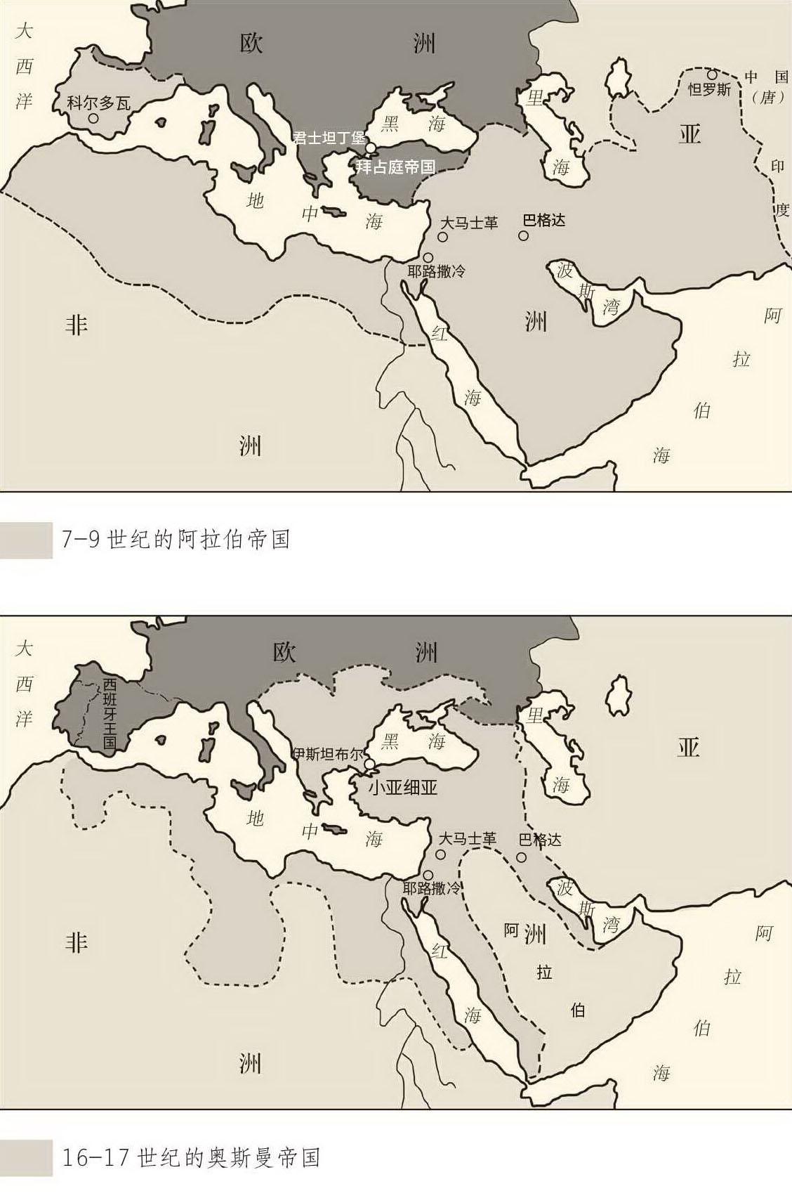 海,主要是地中海,然后是黑海和里海。其实看看地图就知道,两大宗教几乎一开始便以地中海为界:之南是伊斯兰的地盘,之北是基督教的天下。以后的走向也一样:基督教向北,然后向西传播到南北美洲;伊斯兰向南,然后向东传播到印度半岛西部、马来半岛南端和印度尼西亚。